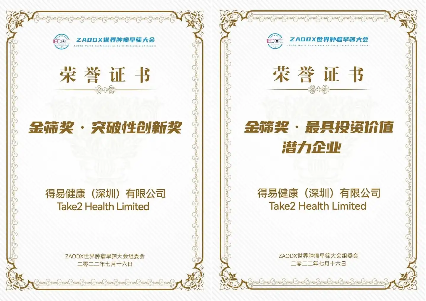 Take2 Health are privileged to have participated in the first ZAODX World Conference on Early Detection of Cancer, and are very honoured to be awarded as The Company with the Most Investment Potential (金篩獎‧最具投資價值潛力企業) as well as The Top Breakthrough Innovation (金篩獎‧突破性創新獎)